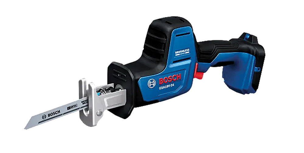 Features include: 94-in. stroke length and zero to 3,100 SPM – for fast, efficient cutting and more material removal in a range of applications; Variable speed trigger switch – controls operating speed for greater tool control; Toolless blade-change system – allows quick blade changes; Lightweight, compact design – weighing only 3.8 pounds and measuring 13.3 in. for maneuverability in tight spaces; LED light – illuminates dimly lit work areas; In-line design – for easier close-to-the-wall cuts; Brushless motor technology – provides a high-performance motor and drive-train system engineered to take full advantage of the additional power generated by CORE18V high power batteries (sold separately); AMPShare System compatibility – 18V batteries and chargers are compatible with Bosch 18V power tools and a growing list of cordless products from AMPShare brand.