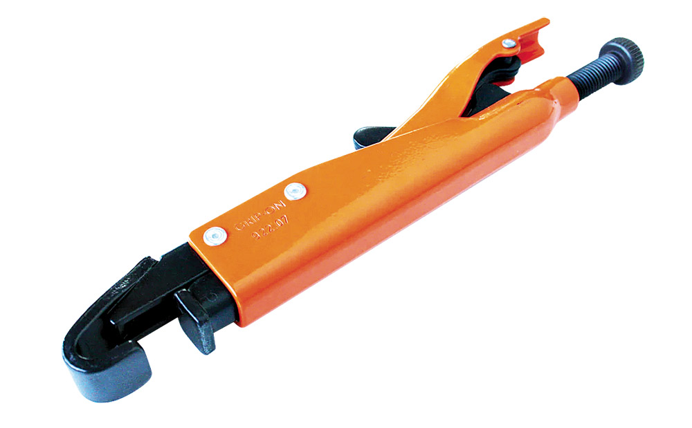 • Pliers designed to clamp two flanged lap joints; straight line motion of the mobile jaw allows offset clamping
