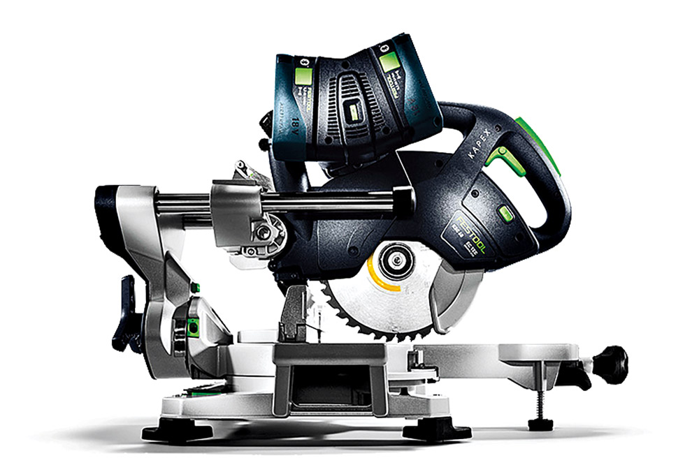 The new KAPEX KSC 60 cordless sliding compound mitre saw produces precise crosscuts in a range of applications with mitre angles of up to 60 degrees on each side and bevel angles of up to 46 degrees right and 47 degrees left. The twin-column guide with two bearings ensures that the saw blade is guided smoothly and with precision whichever setting is chosen. In conjunction with the dual battery system, the brushless EC-TEC motor provides extended endurance.