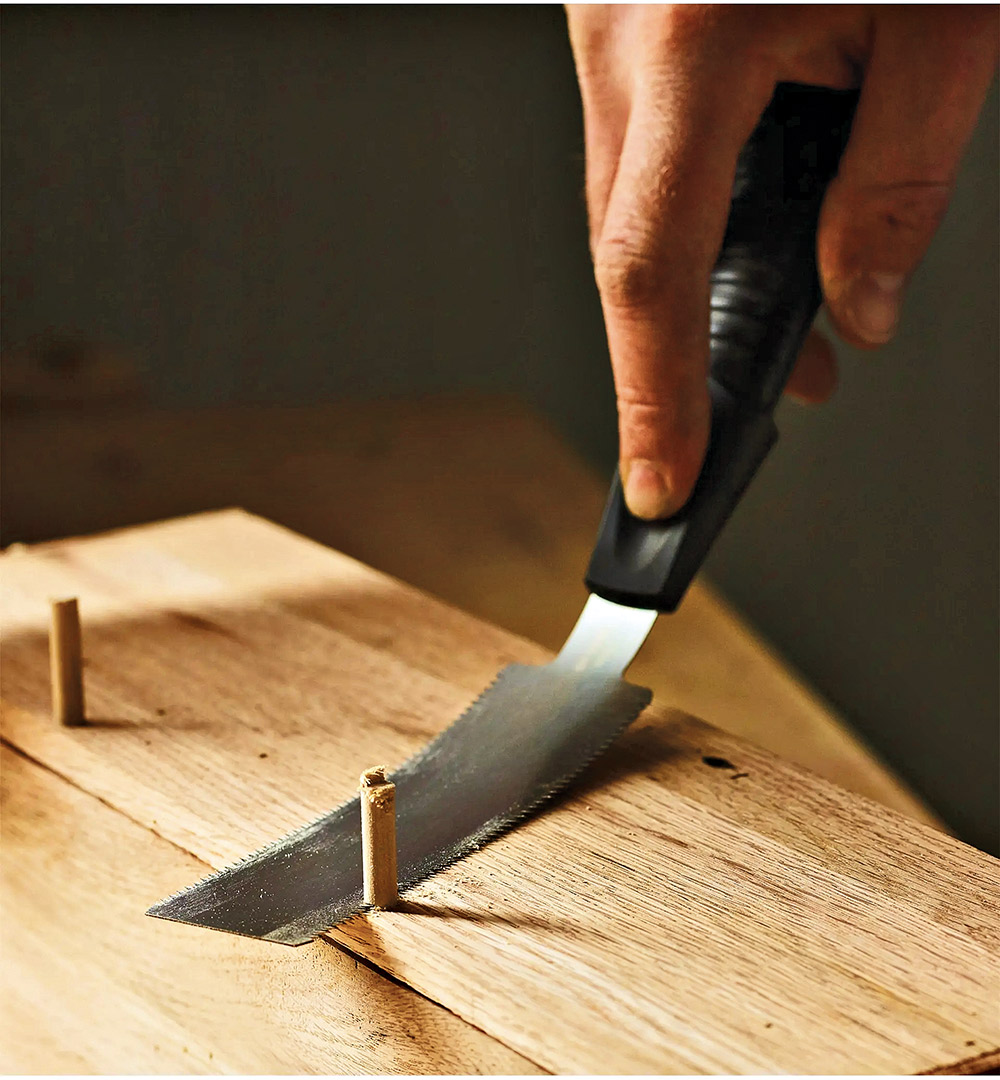 For rapid trimming of plugs and dowels flush with the surface without damaging the surface or the adjoining face. The tooth pattern cuts on the pullstroke. Thin blade is flexible and can be pressed flush on any surface. It is a double-edge style that cuts from either side. leevalley.com