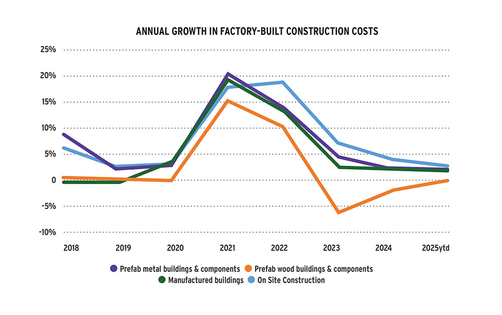 Statistics Canada tracks the factory gate price growth of prefabricated buildings. This is measured as a component of their Industrial Product Price Index (IPPI). We see that the annual year-over-year cost growth between 2018 until the third quarter of 2025 is highly correlated between modular buildings and on-site construction. In both instances, the growth rate of costs have slowed, but continue to compound on the double-digit cost growth seen over 2021 and again in 2022. This strong correlation helps support the view that while modular and other factory-built construction methods offer many benefits over on-site construction, especially speed of construction, hard cost savings is currently not universally true.