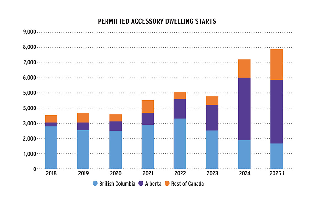 Annual permitted ADU starts make up a small number of overall housing starts right now. However, starts over the past five years show how they are gaining popularity – particularly in Alberta and British Columbia. Starts in 2025 are expected to reach more than 8,000 units. However, the chart below reinforces the reality that if people are not buying new homes, the industry is not producing them. As sales conditions in BC slowed, as measured by the HMI, the number of ADU starts slowed. Alberta’s healthier market has allowed them to produce more than 4,000 units in back-to-back years. This helps illustrate the challenges of managing overhead in producing a product that is subject to large swings in demand.